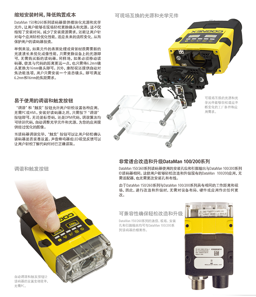 模块化的照明和光路设计简化了 DataMan 150 和 260 系列读码器镜头的更换和现场照明。此设计不仅节省了安装时间和资源占用空间,也通过简易优化各应用性能,以及适应未来的流程更改,保证了读码器的投资。