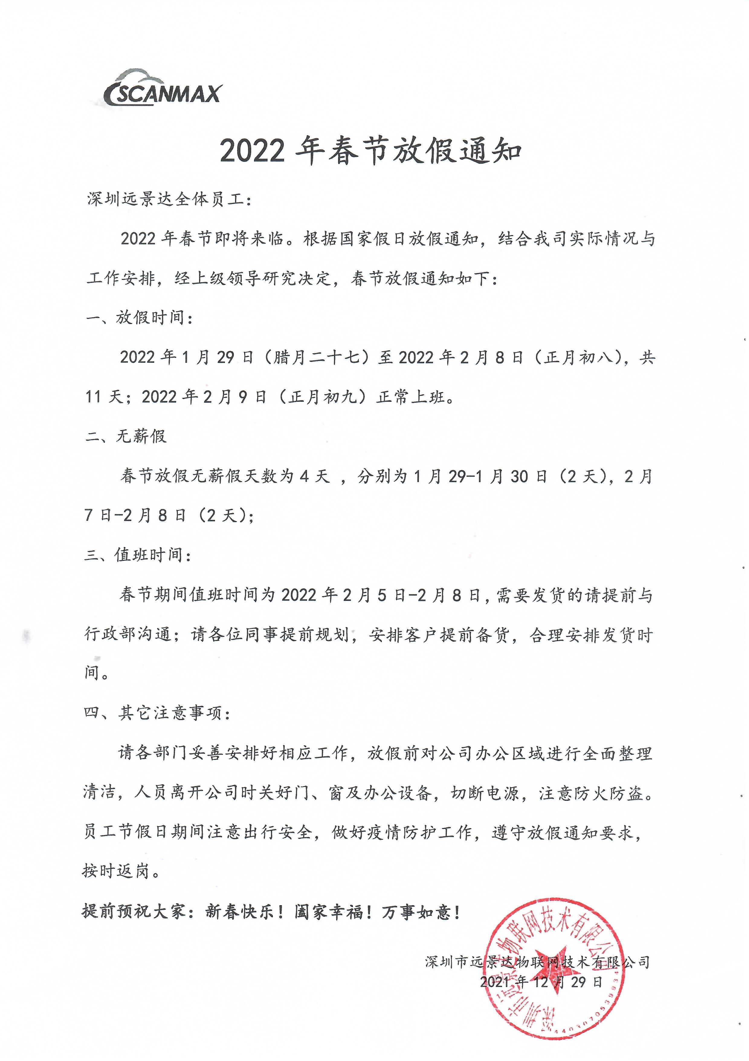 又是一年新春到,金虎迎新送福来。惜别2021,我们迎来了充满希望、机遇与挑战的2022!在此,我们非常感谢广大新老客户一直以来对远景达公司的信任与支持。正值春节来临之际,为了让大家度过一个欢乐、祥和、平安的新春佳节,根据国家假日放假通知,结合我司实际情况与工作安排,经上级领导研究决定,春节放假通知如下: