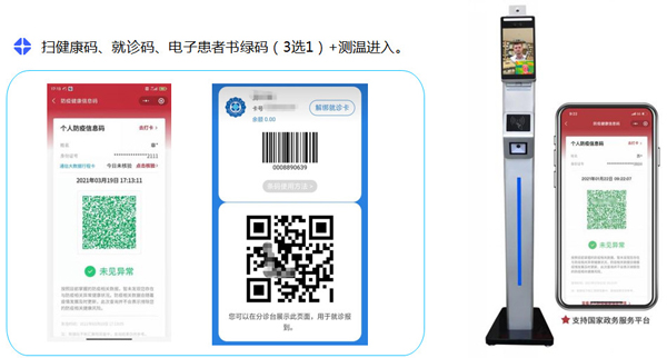 扫健康码、就诊码、电子患者书绿码(3选1)+测温进入。