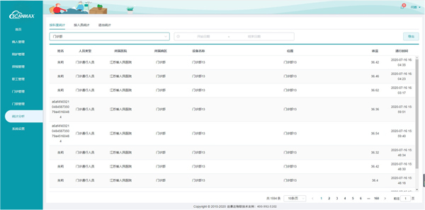 选择统计的数据类型,查看统计数据。例如筛选门诊部,查看单日通过人流量、通过失败等数据。