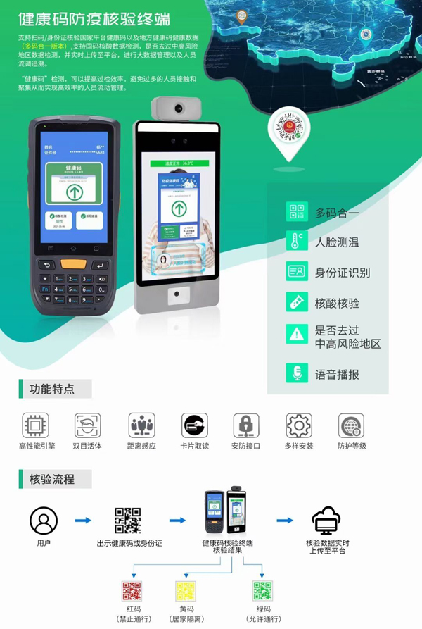 健康码扫码测温一体机及防疫健康码识别解决方案可以大幅提高防疫核验效率、解放人力,是一套完整的精准测温+人脸验证+门禁出入+健康码识别验证+大数据管理流调追溯的非接触式整体解决方案,可助力秋冬季疫情防控。