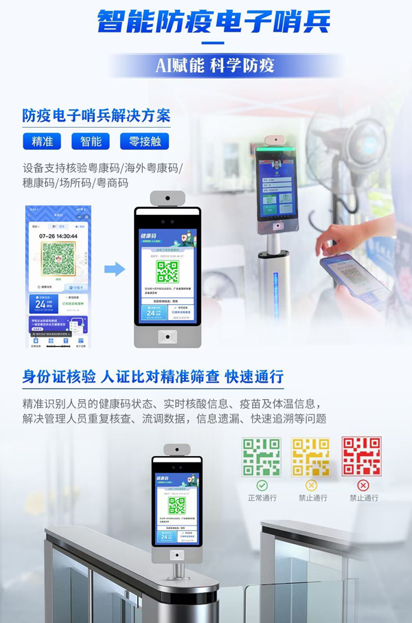 从行业需求来看,纵观校园疫情防控安全管理,健康码人脸测温一体机这项“电子哨兵”产品技术被广泛布局到防疫防控方面,可对师生及来访人员进行有效的识别、记录和把控,为筑牢校园安全线、加强人员管理和场所管理、减轻校园防疫负担等方面起到非常积极的保障安全的作用,同时也能为学校开学实时掌握学生健康动态提供便捷。如果您对此类应用感兴趣,欢迎与我们取得联系!