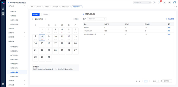 在实际操作中,该系统的便捷性十分突出。酒店将脏布草送洗时,洗涤厂用手持扫码枪批量扫描芯片,10秒内就能完成数百件布草的数量统计,数据实时上传至系统;洗涤完成后,通过RFID复核台进行打扎复核,自动打印包含酒店名称、布草数量的明细标签,避免混送错送;若布草需加急洗涤或二次清洗,系统还能设置专属标记并自动核算费用,无需人工额外记录。对酒店而言,通过网页后台或客户端,可随时查询布草洗涤进度、已清洗次数、库存数量,甚至能追溯每一批布草的交接时间与地点,布草丢失时能快速定位责任环节,彻底告别对账纠纷。