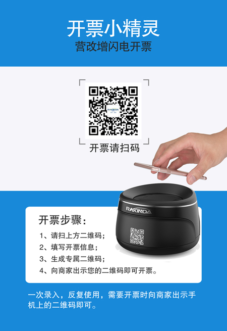 自2017年7月1日税务总局增值税开票新规出来后,商家的开票难度和时间成本剧增的同时也很容易开错发票,一旦开票信息有误,发票便作废无法用于报销。此情此景下,深圳远景达(RAKINDA)推出了极速开票工具,完全颠覆了传统的开票模式。用户只需在支付宝、微信(或其他第三方开票软件)上自行录入开票信息,自动生成“开票二维码”,将此“开票二维码”置于RD4100极速开票终端上一扫即刻自行录入到百旺金赋、航天信息税控(或其他)开票界面,整个过程仅要5秒,是连锁酒店、餐饮、加油站、商场和超市开票首选的极速开票神器。